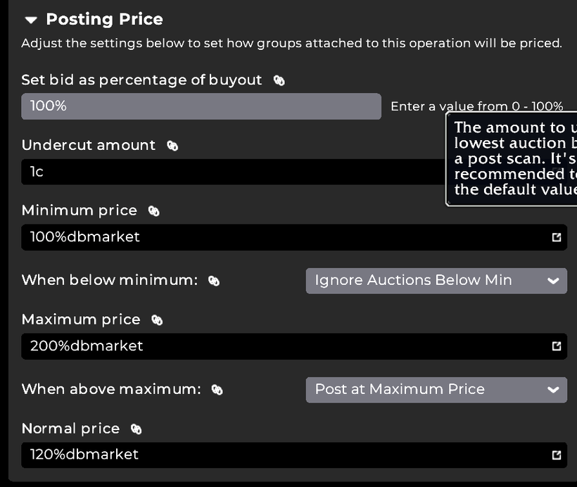 Then there are three prices you need to enter, a minimum a maximum and a normal price. You can then also pick what you want to do if the price is above maximum or below minimum. All the price cells can and should contain a formula rather than a raw gold value. You can type 100g, but then you would need 1 operation for each item and update them every day. In stead use the build in value sources. Dbmarket is the market value of an item and crafting is the crafting cost of an item. You can usually get by with just these two. For crafted items all my operations use crafting for every price. Minimum price is usually between 115% and 130% crafting depending on the market. Normal price is 200-500% crafting and maximum price is 500%-3000%crafting. If the price is below minimum then I set it to don’t post if it is a high deposit item (like crafted gear), or post at minimum if it is a high volume stackable like potions or flasks. For prices above maximum I post at maximum.
