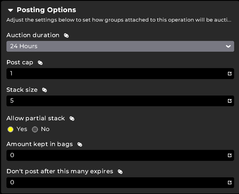 Auctioning operations are the most important ones. These save you an absolute beast of a time. You set the rules for a group for how auctions are posted. In classic you decide both the number of stacks and the stack size and you can have multiple operations. For instance my material flipping groups use 3 different stack sizes and thus 3 different operations.