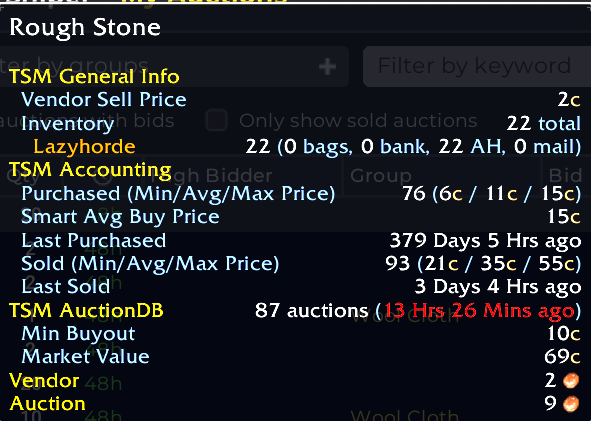 Once you’ve done this you can now post your auctions with a post scan. In stead of entering every item into the AH UI by dragging it, looking at prices and then setting the price you have defined the rules. When you do a post scan TSM will check the current price of the item and then fill out the auctioning UI and you can just click the post button or bind the TSM macro to your scrollwheel and just spam the macro until all your items have been posted.