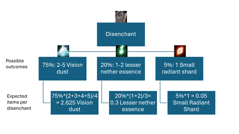 Below I’ve illustrated the disenchant formula so you can see what you get. Usually I focus on vision dust as that is often the most valuable part of the output, but if prices are very low then it is nto enough. If you only look at vision dust the quick check is simply to look at vision dust and mageweave cloth prices. The craft requires 5 mageweave cloth and yields a little over 2.5 vision dust, so if Vision dust is selling for more than 2 times the value of mageweave cloth you are in profitable territory.