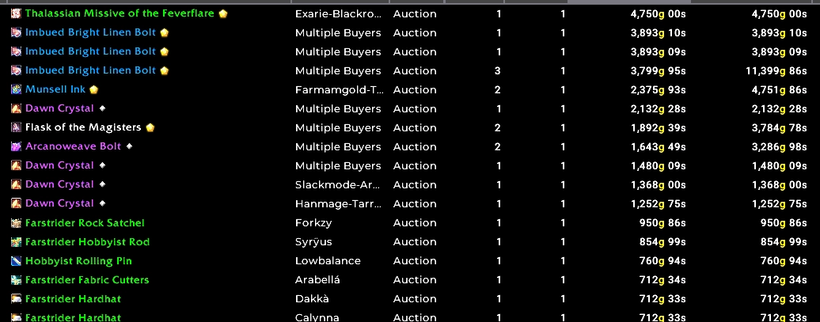 Below you can see my TSM sales across the professions I’ve set up. Basic materials have been quite good so far, and I expect them to be quite good for a while as it will take a while to get there consistently with q2 materials, and even then the price difference should help drive the value.